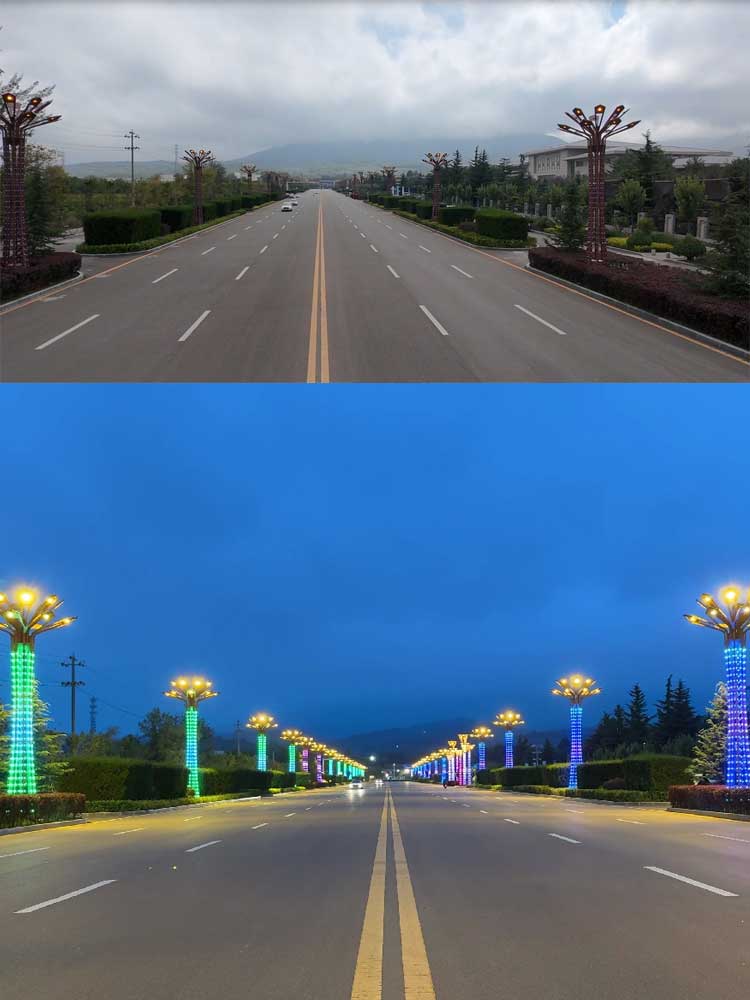 甘肅平?jīng)?米景觀燈項目,安裝位于崆峒山下的市政道路倆側(cè),主光源采用16個LED模組光源組成,配合燈體400的RGB點光源構(gòu)成,系統(tǒng)采用512控制,夜晚整體趁現(xiàn)炫彩效果,亮化倆側(cè)道路。